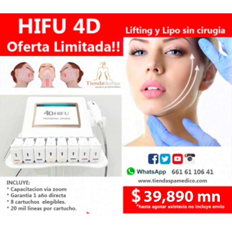 El poder remodelante de los ultrasonidos focalizados de alta intensidad se multiplica con HIFU 4D un equipo de alta gama, que garantiza precisión, seguridad y eficacia en tratamientos de rejuvenecimiento y lifting facial, así como en programas corporales de reducción de grasa localizada y reducción del contorno.Los ultrasonidos focalizados tradicionalmente emiten la energía en una única línea. HIFU 4D va más allá, y a través de la tecnología 3D de filas multidimensionales permite ajustar desde 1 hasta 11 líneas, consiguiendo más efectividad en los tratamientos. El equipo HIFU 4D deposita la energía térmica en los estratos cutáneos profundos, donde provoca controlados puntos de coagulación, responsables de impulsar la contracción del tejido y la renovación del colágeno. De este modo de acción deriva su eficacia en el remodelado y tensionado facial y corporal. En el caso concreto, del rostro estos ultrasonidos HIFU alcanzan incluso el tejido SMAS, la estructura facial más directamente implicada en la juventud del rostro; por eso los resultados que se obtienen son equiparables a los de un lifting quirúrgico. Además, elimina las arrugas de la frente, cuello, ojos, boca… levanta y reafirma las mejillas, mejora la elasticidad cutánea, redibula el óvalo y aporta brillo y luz a la piel