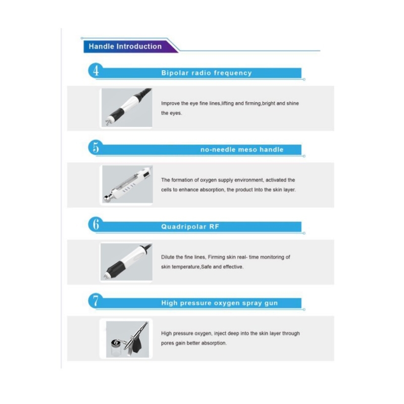 La máquina facial de chorro de agua y oxígeno utiliza oxígeno bajo presión extrema y agua, toma pequeñas gotas de agua, a través de tipo spray para actuar sobre la piel. Puede penetrar los componentes de nutrientes a los poros y grietas de la piel desde la epidermis hasta la capa de la dermis, luego promover el renacimiento de las células, suministrando rápida y directamente nutrientes ricos para la piel. Al mismo tiempo, puede limpiar la suciedad profunda en la epidermis. El oxígeno de presión extrema y el líquido nutriente pueden estimular el renacimiento del tejido de fibra en la dermis, hacer que las células metabolismen. Para mejorar la piel oscura, amarilla, cloasma, obtener un buen efecto de eliminación de arrugas, rejuvenecimiento de la piel, etc. Puede tratar: acné de puntos negros, manchas, eliminación de bolsas, secado, arruga, frente, hidratante, áspero, opaco, suelto, blanqueamiento de la piel