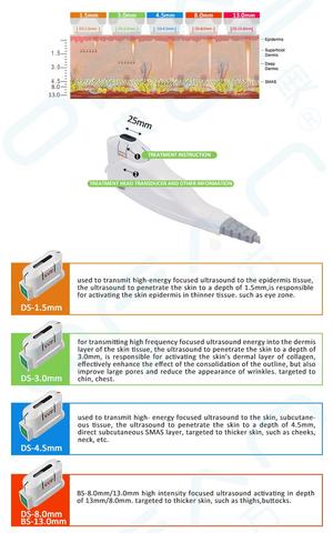 El DS-4.5mm se utiliza para transmitir ultrasonidos enfocados de alta energía a la piel y al tejido subcutáneo. El ultrasonido penetra a una profundidad de 4.5mm y se dirige directamente a la capa subcutánea SMAS, dirigida a pieles más gruesas, como mejillas, cuello, etc.