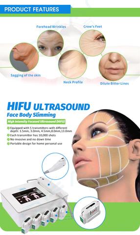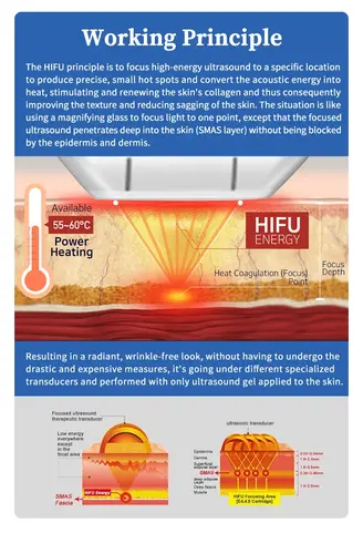 El ultrasonido focalizado de alta intensidad (HIFU) transfiere directamente la energía térmica a la piel y al tejido subcutáneo, lo que estimula y renueva el colágeno cutáneo, mejorando la textura y reduciendo la flacidez. Literalmente, el Hifu Infinito PRO puede lograr los resultados de la cirugía plástica o el lifting corporal sin cirugía invasiva ni inyecciones.