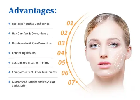 - Se utiliza principalmente para toda la gama de envejecimiento del tejido de la piel, arrugas, envejecimiento de la piel áspera, para remodelar el rostro y levantar eficazmente los tejidos de los ojos y el cuello.