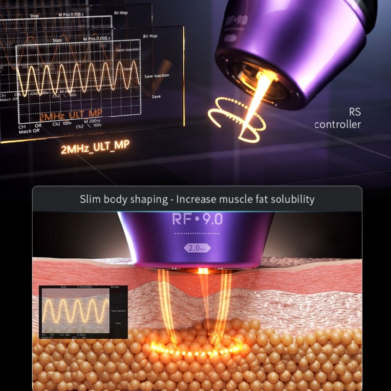 El principio utiliza un sistema de ultrasonido pulsado ultrafino para generar energía térmica para destruir y disolver la grasa células y estimulan la capa fascial.Se encoge inmediatamente y produce una gran cantidad de colágeno nuevo para reorganiza, construye una nueva red de fibras de colágeno y mejora la elasticidad de la piel desde la capa inferior.