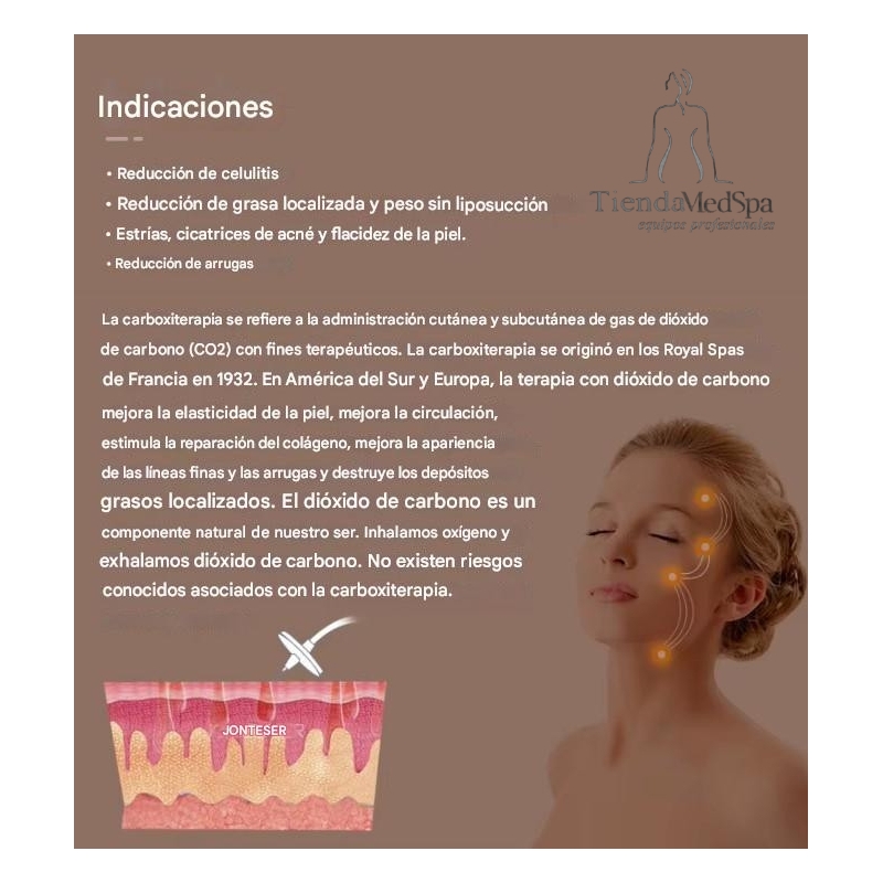 La terapia con dióxido de carbono mejora la elasticidad de la piel, mejora la circulación, estimula y repara el colageno, mejora la apariencia de lineas finas y arrugas, destruye depósitos grasos localizados. El dióxido de carbono es un componente natural de nuestro ser. Inhalamos oxígeno y exhalamos dióxido de carbono. No existen riesgos conocidos asociados con carboxiterapia.