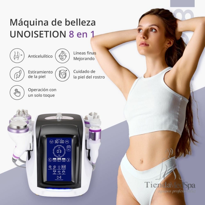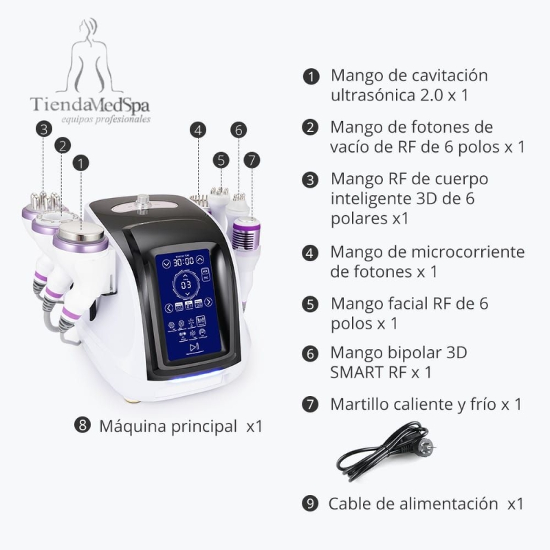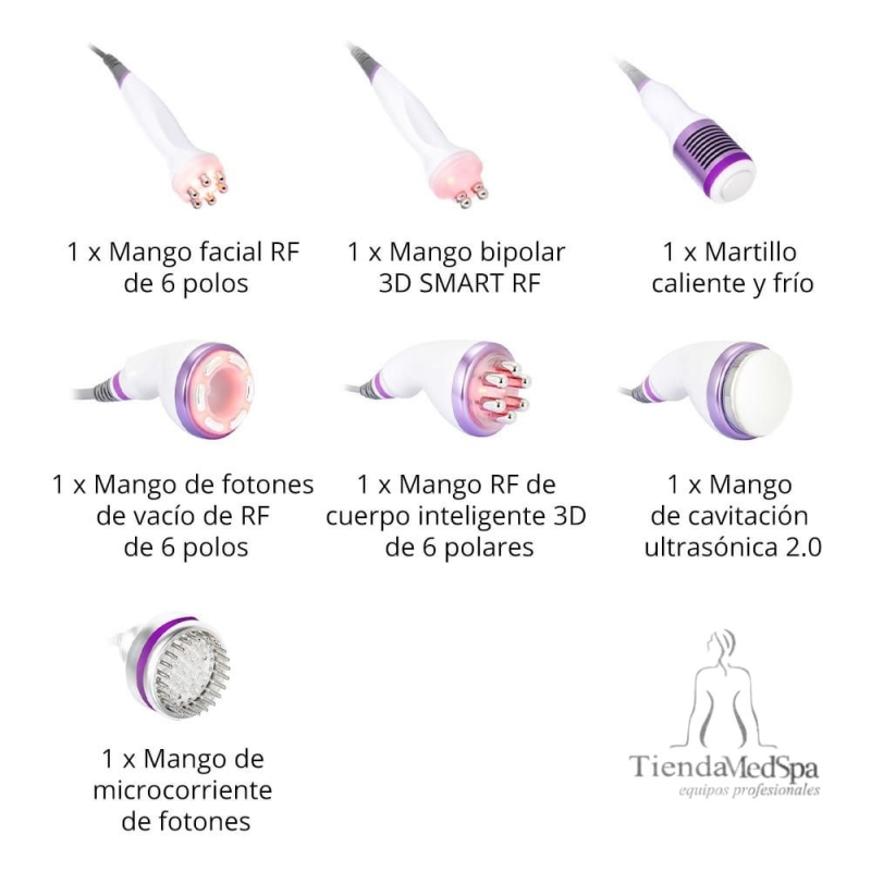 Este equipo trabaja para adelgazar el cuerpo, reducir la grasa, combatir el envejecimiento, reafirmar la piel, lifting facial, etc. Hay mango de RF sextupolar, mango de cavitación 40K 2.0, mango de RF cuadripolar al vacío, mango de RF de 2 polos, mango de RF de 8 polos, mango de microcorriente y fotón y martillo frío. A diferencia de la liposucción, la cavitación de grasa por ultrasonido no requiere ningún procedimiento quirúrgico, por lo que no hay anestesia, sangre ni vendajes.