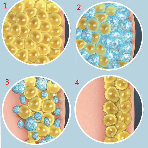 Como triglicéridos en grasas se convierte en sólido, en particular, las bajas temperaturas, se utiliza la tecnología de refrigeración avanzada para atacar selectivamente protuberancias de grasa y eliminar las células grasas a través de un proceso gradual que no daña los tejidos circundantes, reducir la grasa no deseada, Cuando las células grasas se exponen a refrigeración precisa, desencadenan un proceso de eliminación natural que reduce gradualmente el espesor de la capa de grasa. Y las células de grasa en la zona tratada se eliminan suavemente a través de proceso normal metabolismo del cuerpo, para eliminar la grasa no deseada.