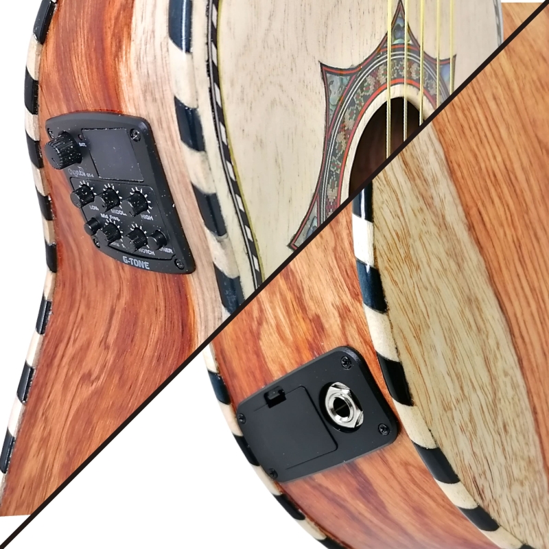 Lo que hace que esta vihuela sea aún más especial es su capacidad electroacústica. Equipada con una pastilla que incluye un afinador incorporado, esta vihuela te permite amplificar tu sonido sin sacrificar la calidad tonal. Ya sea que estés tocando en un escenario o grabando en el estudio, contar con un afinador integrado te brinda la comodidad y la precisión necesarias para mantener tu instrumento siempre en sintonía.