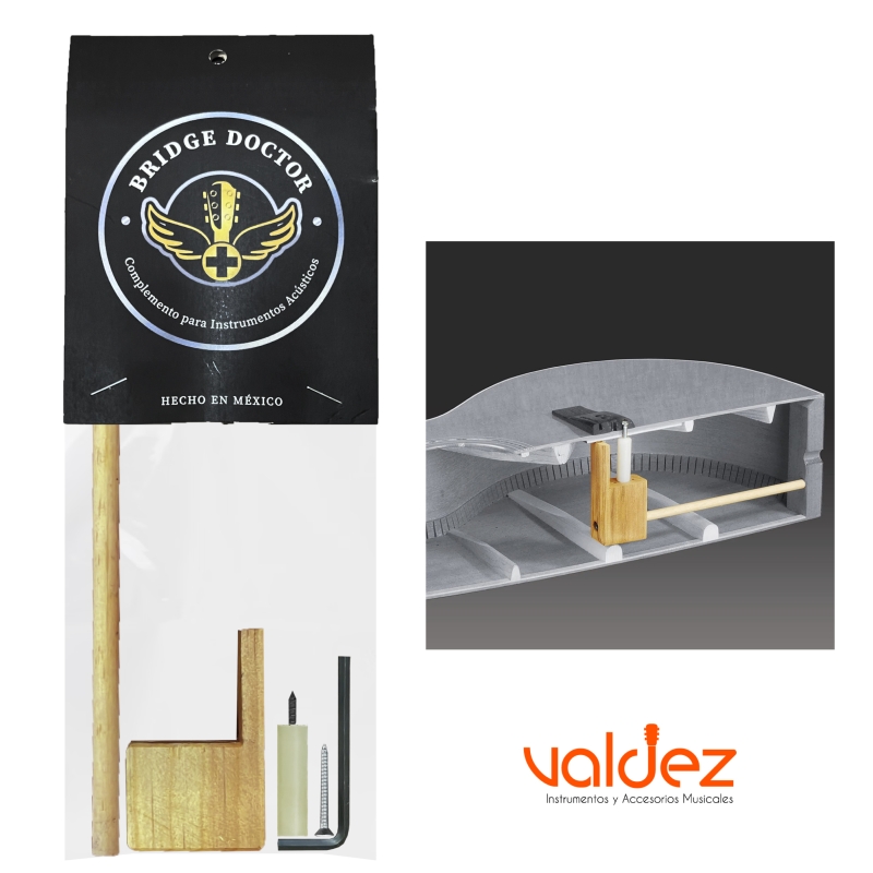 El Doctor Puente o Bridge Doctor, es el sistema que refuerza el puente de tu guitarra de 6 o 12 cuerdas y una amplia variedad de instrumentos de cuerda. Previene y combate el levantamiento del puente, así como el arqueo de la tapa superior ocasionado por la alta tensión o el uso de encordado doble.