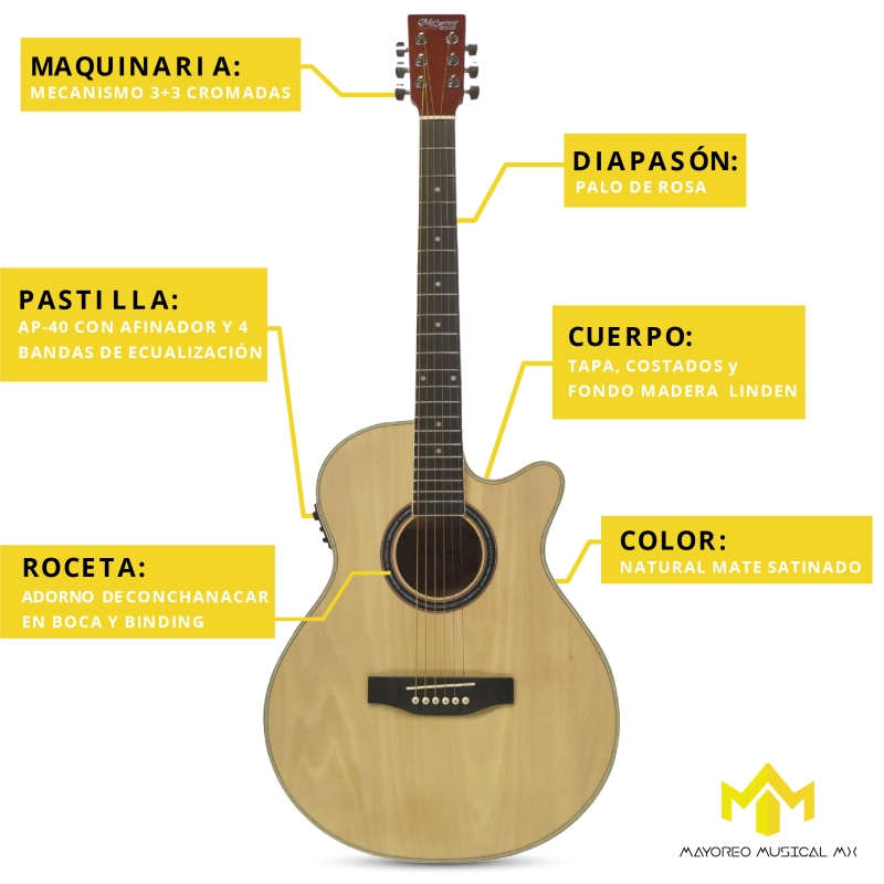 La McCartney Natural QAG40-EQ/NT es una guitarra que destaca por su equilibrio perfecto entre sonido, diseño y funcionalidad. Ideal para quienes buscan un instrumento versátil, tanto para tocar de manera acústica como para amplificar el sonido, esta guitarra tiene todo lo necesario para un desempeño excelente en cualquier escenario.