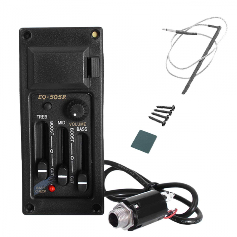 La pastilla EQ505 de Belcat es un preamplificador para guitarra Western con un ecualizador que controla graves, medios y agudos (+/- 12 dB cada uno). Cuenta con un rango de frecuencia de 20 Hz - 20 kHz, control de volumen, interruptor de corte de sonido y LED para estado de batería. Incluye pastilla piezoeléctrica y jack endpin.