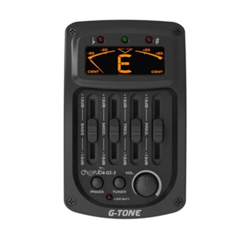 El micrófono activo Cherub GS3 para guitarra electro acústica es un preamplificador que tiene 4 bandas de ecualización, inversión de fase y equipa un afinador cromático con pantalla LCD de alta definición. Cuenta con alerta de batería baja. El GS3 es fácil de instalar dentro de una guitarra y su tamaño es de sólo 55mm * 92mm * 33mm. Alta calidad y desempeño al mejor precio.