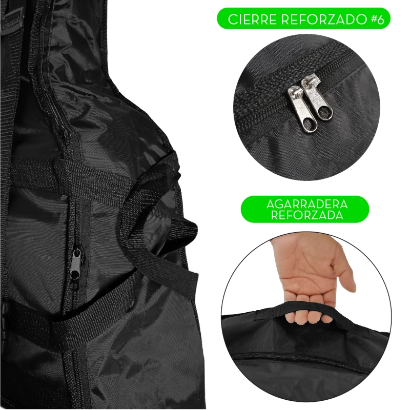 Si estas buscando una funda que sea comoda y segura para tu guitarron,esta funda es para ti ya que cuenta con colchado para protegerlo de caidas leves,tambien protegelo de salpicaduras de agua e incluso lluvias leves.