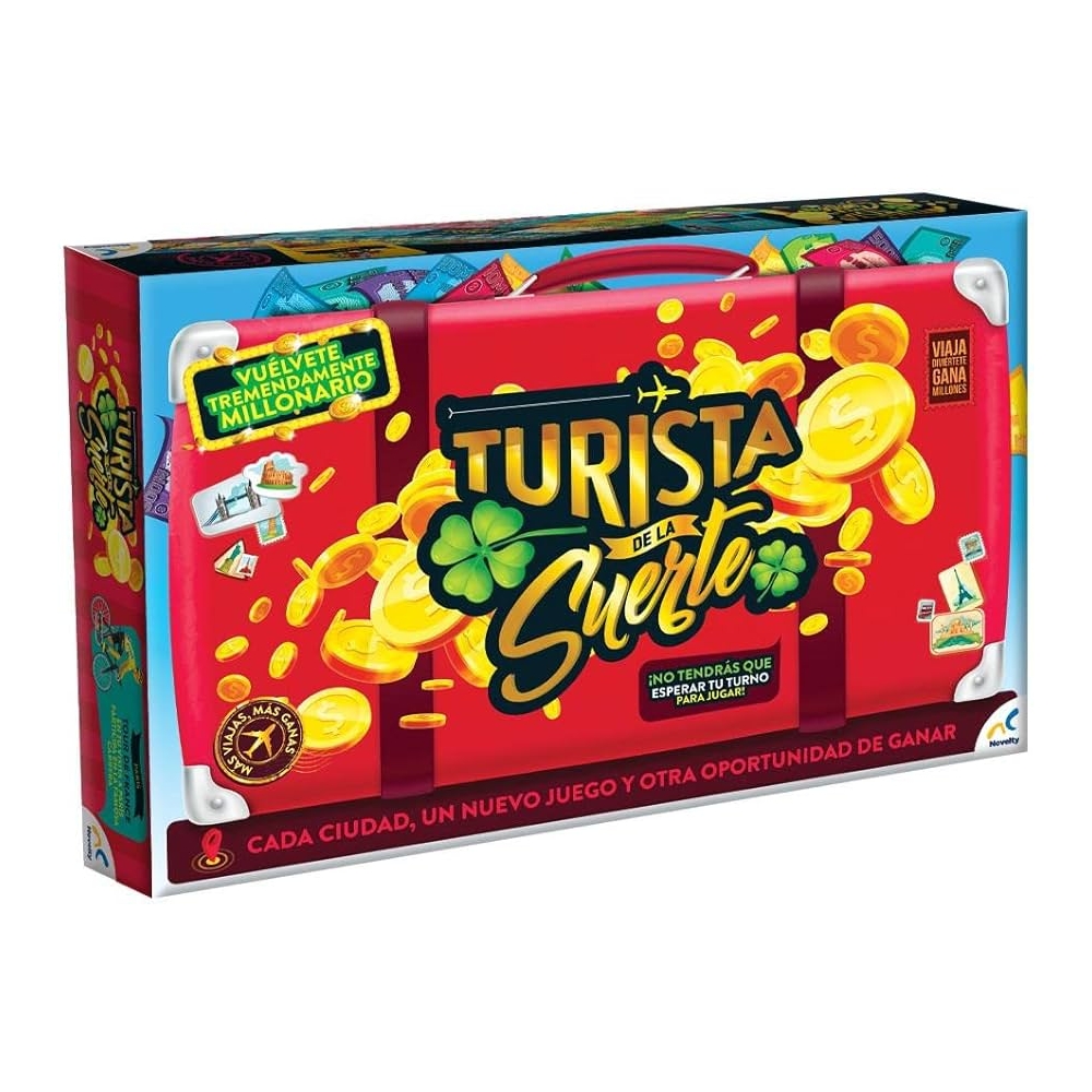 Turista de la suerte, divertido juego de mesa familiar, vuélvete tremendamente millonario viajando por distintas ciudades, pero no tendrás que esperar tu turno para seguir jugando ya cada una de las casillas tiene apuestas y competencias en las que todos podrán participar y tener la oportunidad de ganar mas millones. ideal para pasar horas de diversión. contenido tablero, 6 peones, billetes y fichas para apuestas.