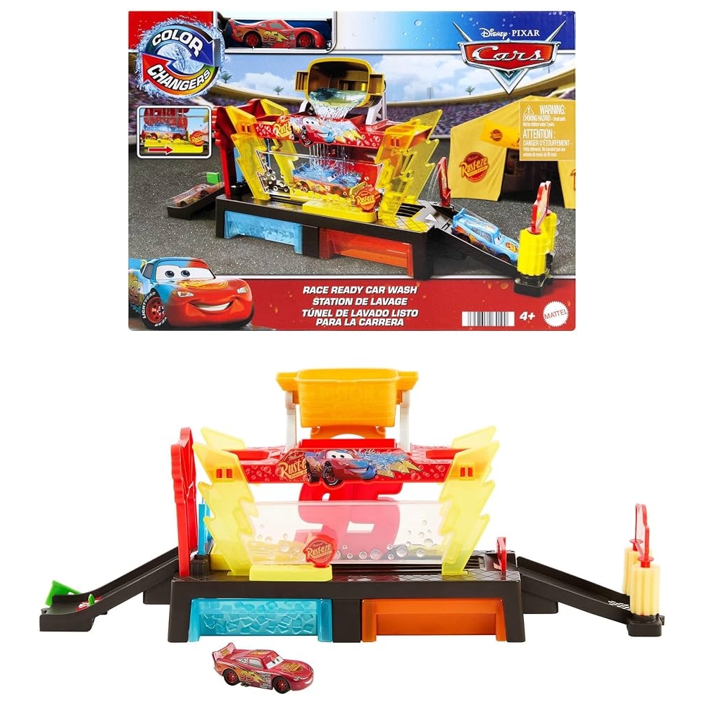 Prepara a El Rayo McQueen para la proxima competencia con el set de juegos Color Changers Autolavado Rayo McQueen de Cars de Disney y Pixar.