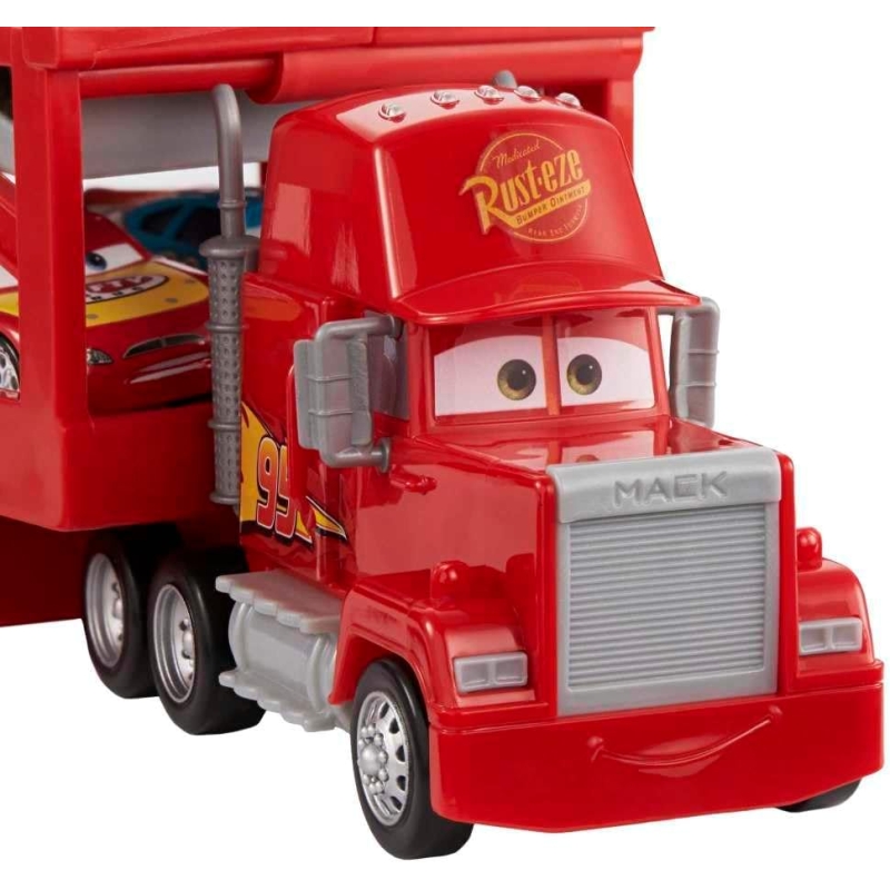 El Mack Hauler cuenta con un diseño llamativo y detalles auténticos, incluyendo el icónico número 95 y los gráficos de Lightning McQueen. Su amplio remolque permite transportar varios autos de carreras, ofreciendo horas de juego creativo y dinámico.