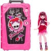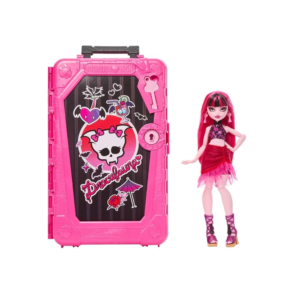 Dentro de la maleta se oculta una vampiresa lista para brillar. Usa la llave frontal para desbloquear su puerta y descubrir a Draculaura con un atuendo vacacional colmilludo y más de 19 accesorios que inspiran moda, misterio y diversión al instante.