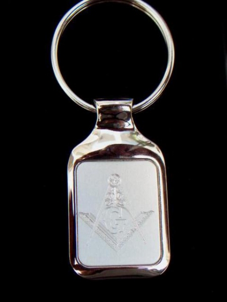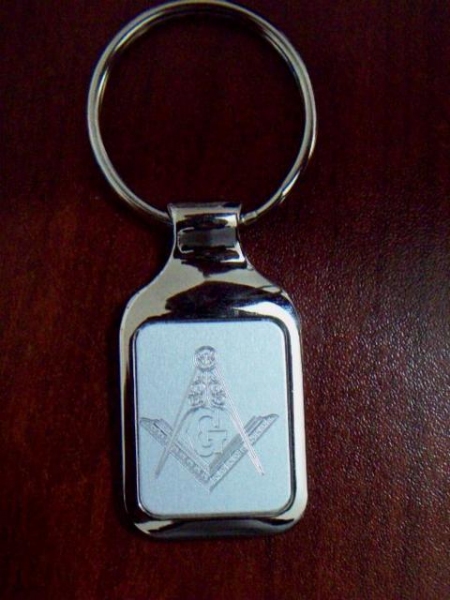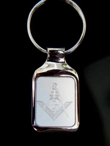 Hermoso llavero masónico con escuadra y compás, elaborado en acero inoxidable, con placa en acabado mate y grabado con pantógrafo con punta de diamante.