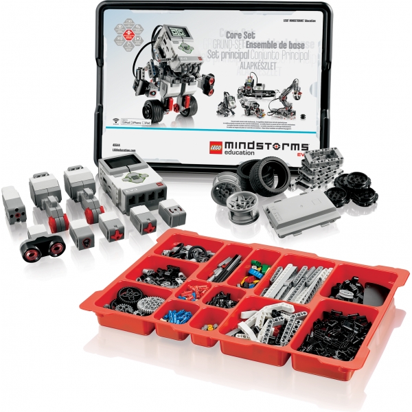 El set básico 45544 LEGO MINDSTORMS Education EV3 del sistema educativo EV3 se presenta con el Ladrillo inteligente EV3, batería recargable, nuevos sensores, nuevos servo-motores, gran selección de piezas y ladrillos, una rueda esférica nueva e instrucciones de ensamblaje.