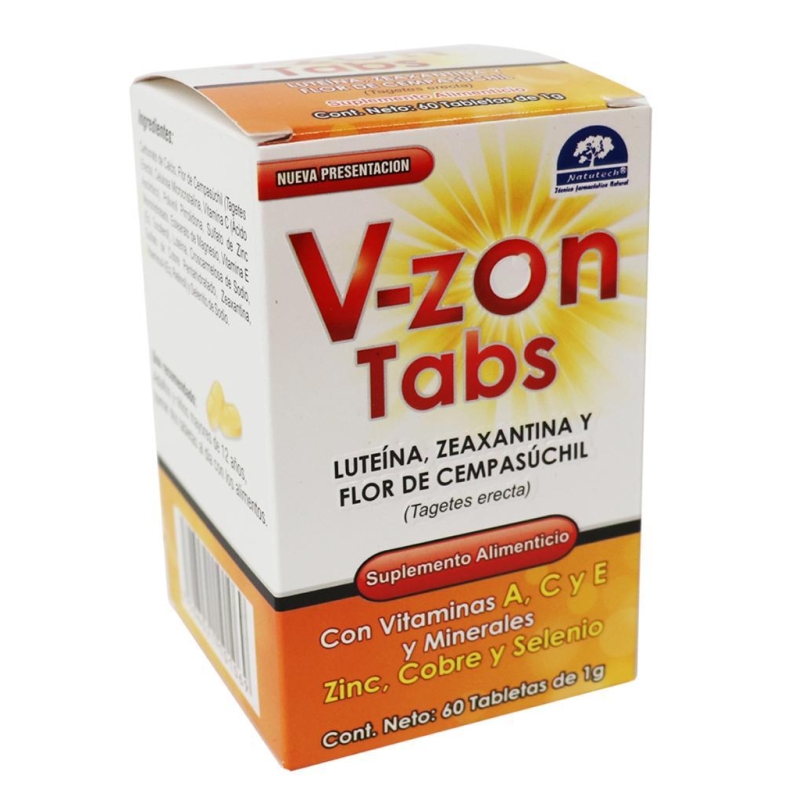 V-ZON TABS® Es un suplemento alimenticio que se emplea como auxiliar en la prevención de cataratas, previene la degeneración macular y protege la retina ya que contiene carotenoides que no pueden ser sintetizados por el organismo por lo que es necesario incorporarlos en la dieta.