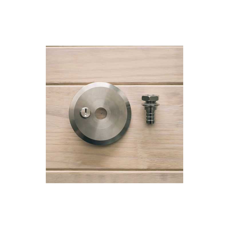 Tapadera TC con perforación en el centro de 17 mm para introducir mangueras, tubos o tapón #2. Incluye válvula de alivio de presión y conector de acero inoxidable de 1/2"