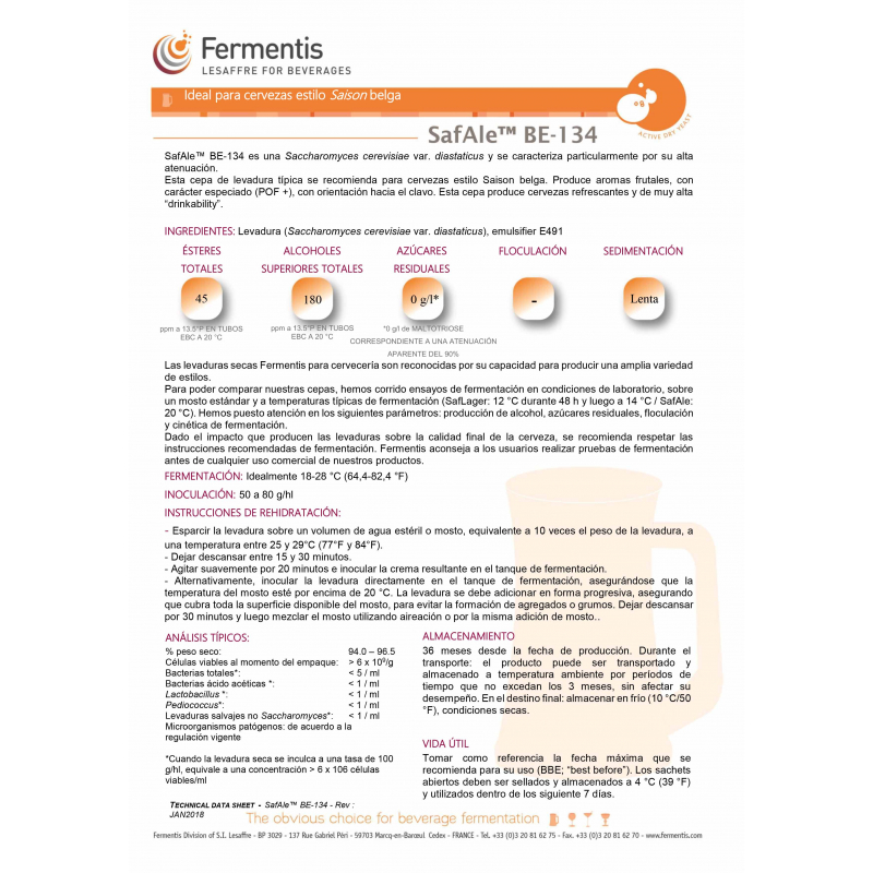 SafAle™ BE-134 es una Saccharomyces cerevisiae var. diastaticus y se caracteriza particularmente por su alta atenuación. Esta cepa de levadura típica se recomienda para cervezas estilo Saison belga. Produce aromas frutales, con carácter especiado (POF +), con orientación hacia el clavo. Esta cepa produce cervezas refrescantes y de muy alta “drinkability”.