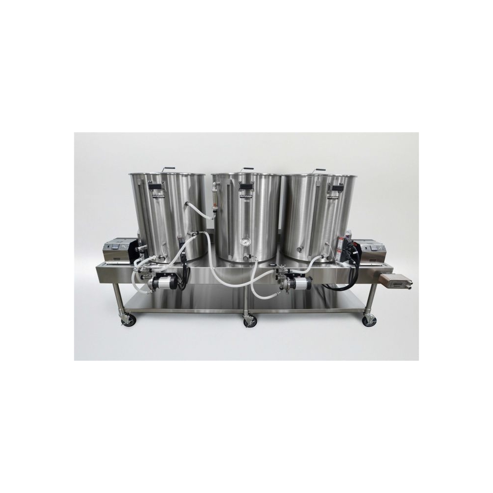 Perfectos para el uso doméstico o como sistemas piloto para cervecerías comerciales, estos sistemas utilizan tres hervidores BoilerMaker ™ de primera línea con una conexión horizontal donde dos bombas RipTide ™ mueven el agua y el mosto entre los hervidores y a través del enfriador Therminator ™.