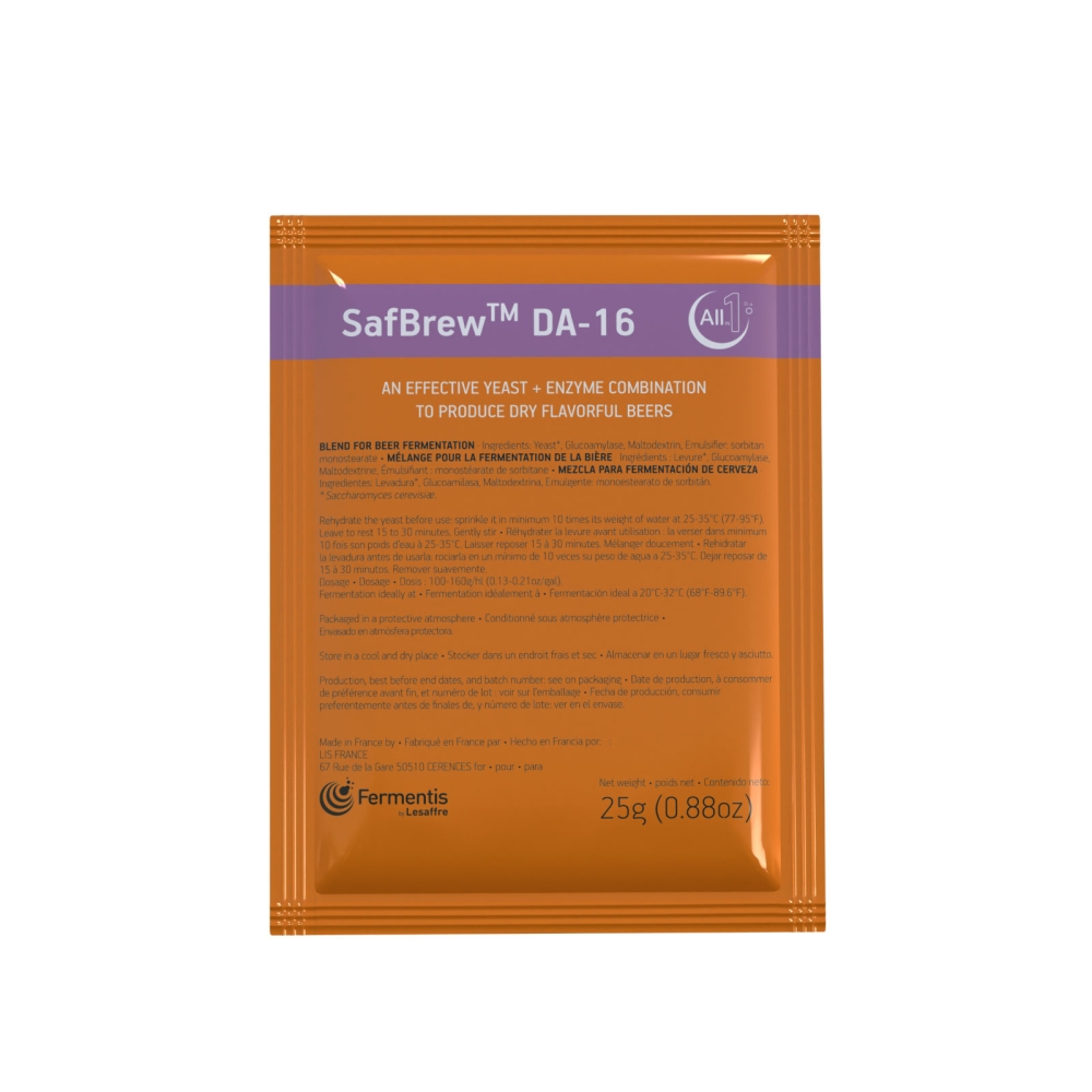 SafBrew™ DA-16 es la opción perfecta (mezcla de levadura activa seca y enzimas) para la producción de cervezas secas y aromáticas, particularmente con un perfil afrutado y a lúpulo, como las Brut IPAs. SafBrewTM DA-16 también es recomendada para fermentaciones de mostos de alta densidad específica (VHG; very high gravity), permitiendo llegar a niveles de alcohol de hasta 16% vol./vol.