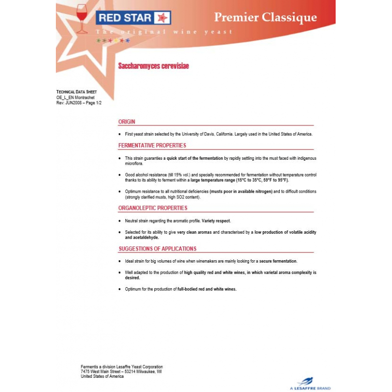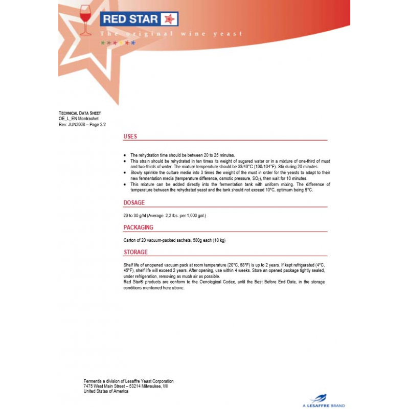 Levadura Montrachet es útil en la producción de vinos secos, llenos de cuerpo, tanto tintos y blancos. Es una levadura de fermentación vigorosa con buena tolerancia al alcohol de 13%.