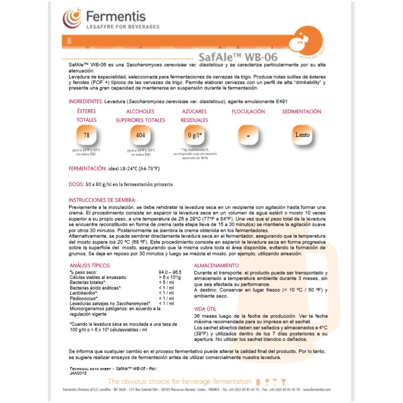 SafAle™ WB-06 es una Saccharomyces cerevisiae variedad diastaticus y se caracteriza particularmente por su alta atenuación.