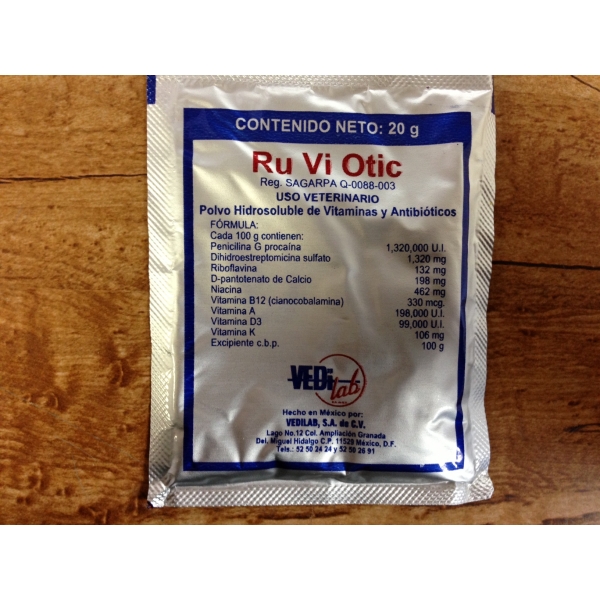It is a powder to be diluted in the drinking water or feed. Useful in conditions requiring a single medication, the combined effect of antibiotics and vitamins as in the case of infectious diseases or in different states of stress to combat opportunistic bacteria. When administering RU OTIC VI gives an effective antibiotic and vitamins that strengthen the status of the animal.