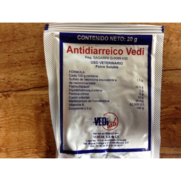 ADMINISTRATION AND DOSAGE: Oral in drinking water. Dissolve 1 gr of ANTIDIARREICO VEDI for each 5 kg of weight in warm water, give the intake every 8 hours in the case of small species and every 12 hours in large species. Administer it for 3 to 5 days.