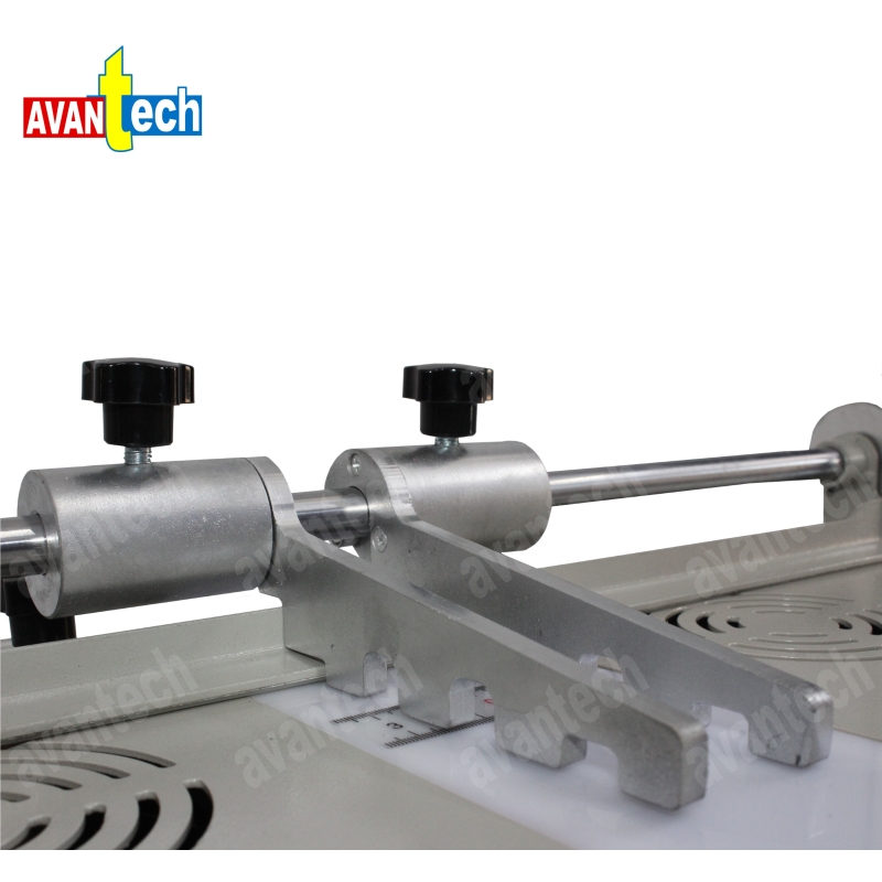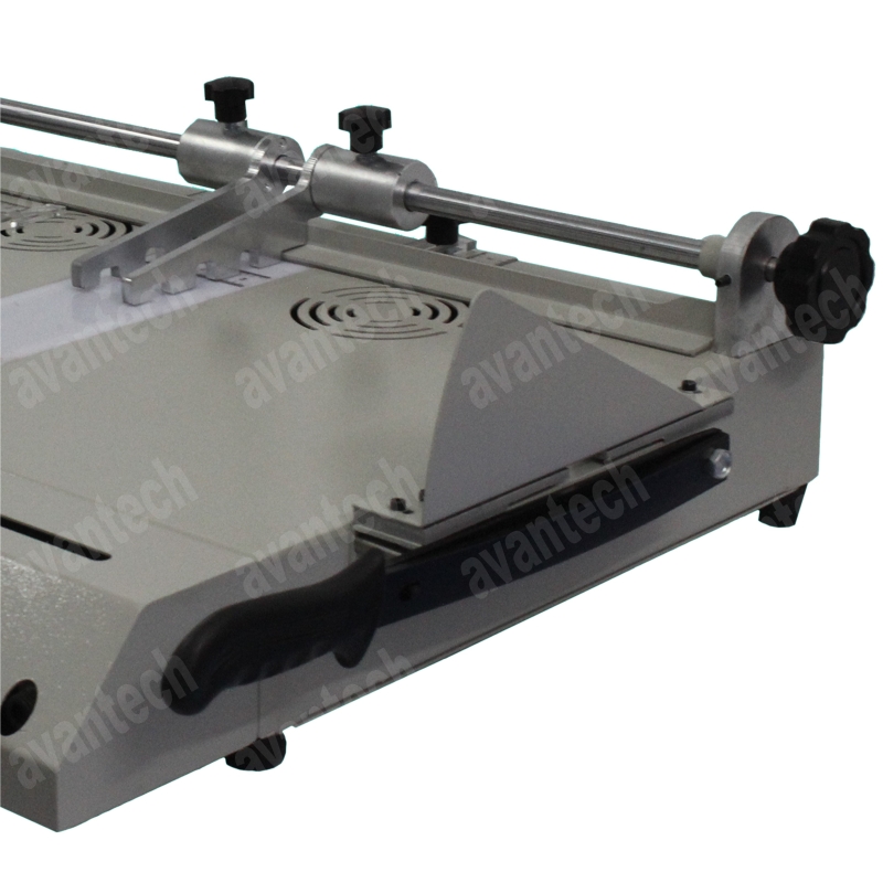 Y finalmente viene con una guillotina, la cual está diseñada y colocada de tal forma que solo se corte el sobrante de la esquina del sustrato, cuando este ya está fijado al cartón, evitando así que quede “hecho bolas” en las esquinas.