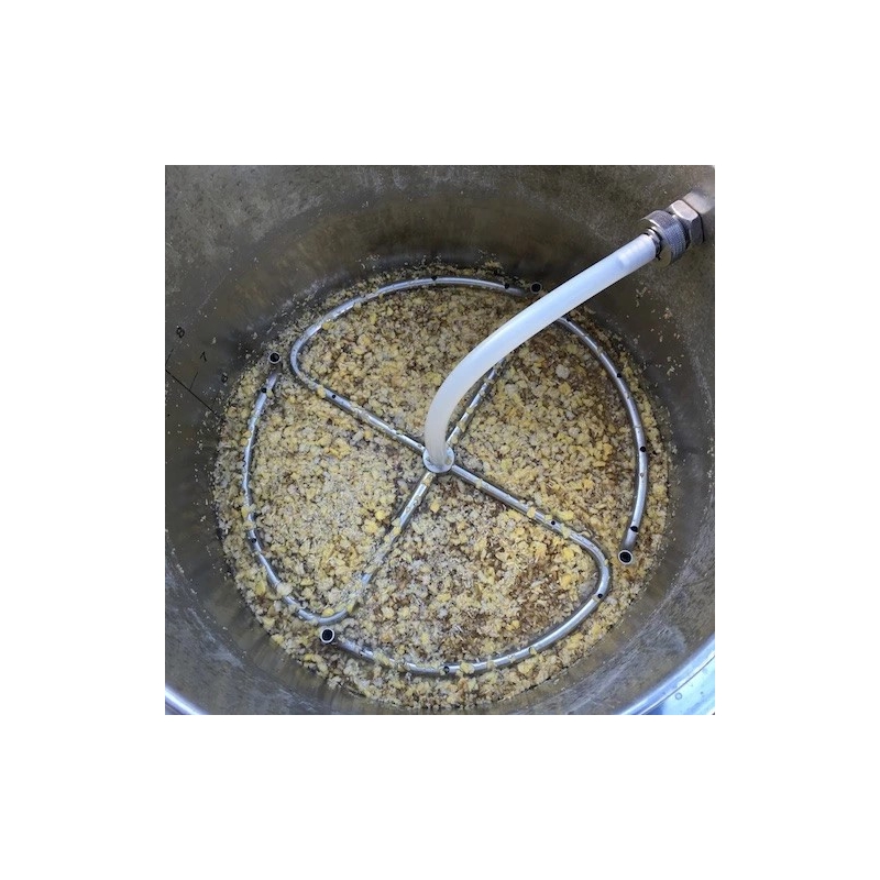 Se coloca en la parte superior del grano durante el macerado para realizar el recirculado (Vorlauf) y el lavado (sparge), su diseño permite colocarlo directamente sobre el grano sin que se hunda y cuenta con 24 perforaciones en la parte superior que facilitan el flujo.