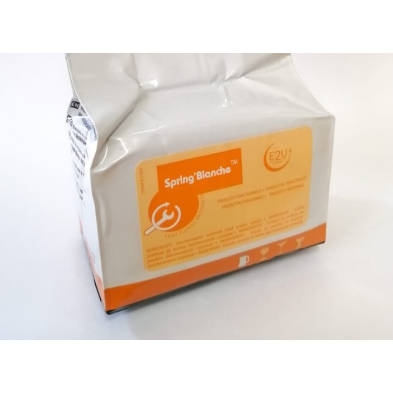 Spring'Blanche contiene proteínas que interactúan específicamente para producir una turbiedad estable y permanente, además ayuda a producir un amargor no tan áspero en las cervezas.
