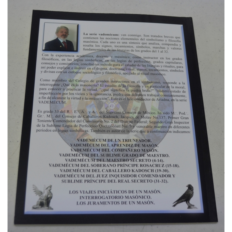 La serie vademécum: ven conmigo. Son tratados breves que contienen las nociones elementales del simbolismo y filosofía masónica. Cada uno es una síntesis que analiza, compendia y resalta los signos, símbolos y valores fundamentales de las liturgias de los grados del 1 al 32.