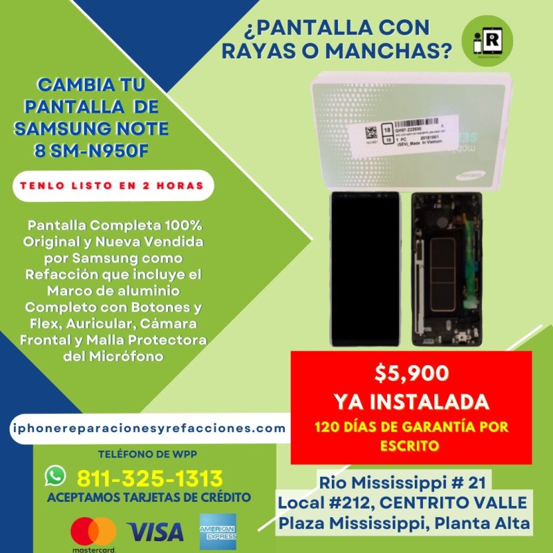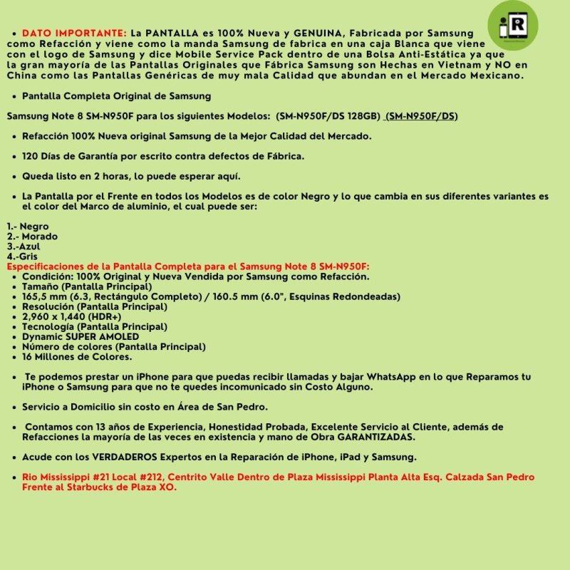 Cambio de Pantalla Completa 100% ORIGINAL y NUEVA incluye Marco de Aluminio para Samsung Note 8 para los siguientes Modelos SM-N950F (International), SM-N950A (AT&T), SM-N950V (Verizon), SM-N950T (T-Mobile), SM-N950P (Sprint) , SM-N950R (US Cellular), SM-N950U (Unlocked)