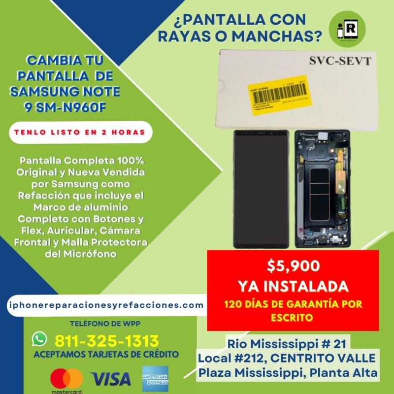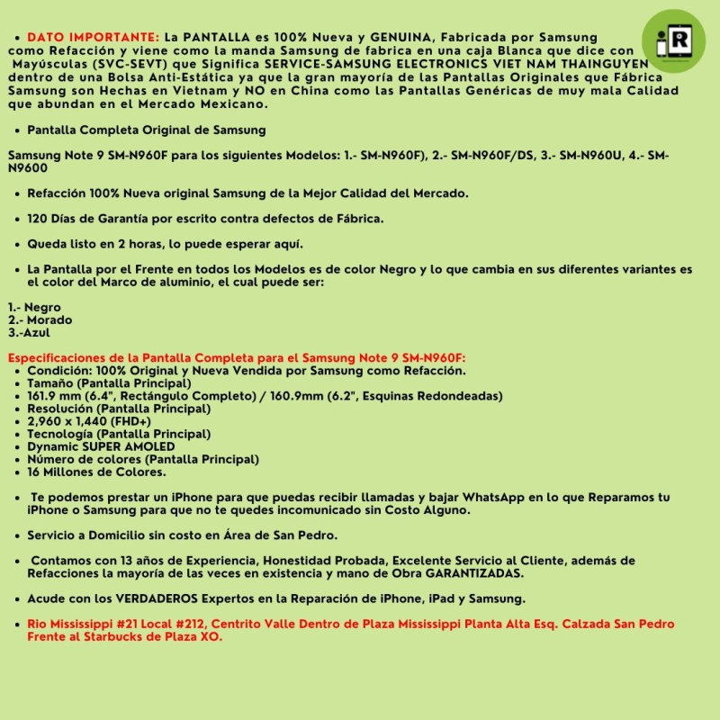 La gran ventaja de haber adquirido un Smartphone Note 9 es que Samsung Si vende Refacciones Genuinas y Nuevas y tu podrás preguntarte como saber que una Pantalla es 100% Original y Nueva y que fue vendida como Refacción por Samsung y tu lo puedes distinguir porque principalmente las Pantalla de Note 9 Modelo SM-N960F que es el modelo que se vende en México viene con el Marco de Aluminio Completo con Botones y Flexes incluidos así como del Auricular, el Vibrador y la Malla protectora del Altavoz que vienen sellados y no podrá entrar el agua y trae protectores plásticos en todo el rededor de el Marco de Aluminio donde vienen los Botones con los Flexes además de que traen otros protectores plásticos por dentro de la Pantalla que se localizan de izquierda a derecha y de arriba a abajo en el Micrófono Superior, en el Protector de los Lentes de las Cámaras, en el Auricular, en el Flex de Proximidad, en el Procesador de la Tarjeta Madre que esta a un lado del conector principal de la Pantalla y en el Micrófono Inferior que nunca podrá traer una Pantalla Usada y así exactamente como vez en las fotografías de la publicación recibirás la nueva Pantalla en su caja Original con el Logo de Samsung y dice en la caja Mobile Service Part con Bolsa Antiestática o en una caja Blanca que dice con Mayúsculas (SVC-SEVT) que Significa SERVICE-SAMSUNG ELECTRONICS VIET NAM THAI dentro de una Bolsa Anti-Estática y si tienes alguna otra pregunta o duda estamos para aclarar antes de que hagas tu compra para que este completamente bien convencido de lo que estas comprando por eso damos 120 días de garantía sobre defectos de fabrica y hasta la fecha no nos ha fallada ni una sola pantalla que hemos vendido en línea o instalado en nuestro Laboratorio Especializado, esa es la gran ventaja de vender refacciones 100% Genuinas y Nuevas.