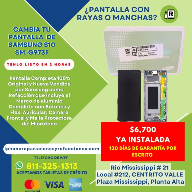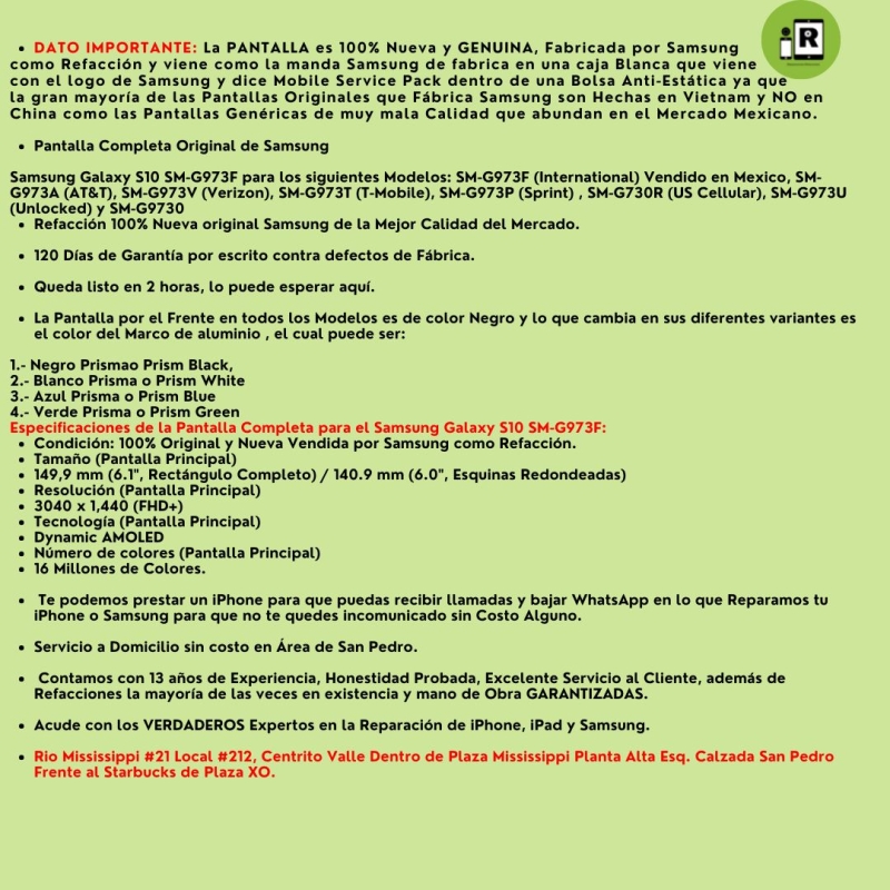 La gran ventaja de haber adquirido un Smart Phone S10 es que Samsung Si vende Refacciones Genuinas y Nuevas y tu podrás preguntarte como saber que una Pantalla es 100% Original y Nueva y que fue vendida como Refaccion por Samsung y tu lo puedes distinguir porque principalmente las Pantalla de S10 modelo SM-G973F que es el modelo que se vende en Mexico viene con el Marco de Aluminio Completo con Botones y Flexes incluidos así como del Auricular, el Vibrador y la Malla protectora del Altavoz que vienen sellados y no podrá entrar el agua y trae protectores plásticos en todo el rededor de el Marco de Aluminio donde vienen los Botones con los Flexes además de que traen otros protectores plásticos por dentro de la Pantalla que se localizan de izquierda a derecha y de arriba a abajo en el Micrófono Superior, en el Protector de los Lentes de las Cámaras, en el Auricular, en el Flex de Proximidad, en el Procesador de la Tarjeta Madre que esta a un lado del conector principal de la Pantalla y en el Micrófono Inferior que nunca podrá traer una Pantalla Usada y así exactamente como vez en las fotografías de la publicación recibirás la nueva Pantalla en su caja Original con el Logo de Samsung y dice en la caja Mobile Service Part con Bolsa Antiestática además incluimos el Adhesivo Original y Nuevo para la Carcasa Trasera y si tienes alguna otra pregunta o duda estamos para aclarar antes de que hagas tu compra para que este completamente bien convencido de lo que estas comprando por eso damos 120 días de garantía sobre defectos de fabrica y hasta la fecha no nos ha fallada ni una sola pantalla que hemos vendido en línea o instalado en nuestro Laboratorio Especializado, esa es la gran ventaja de vender refacciones 100% Genuinas y Nuevas.