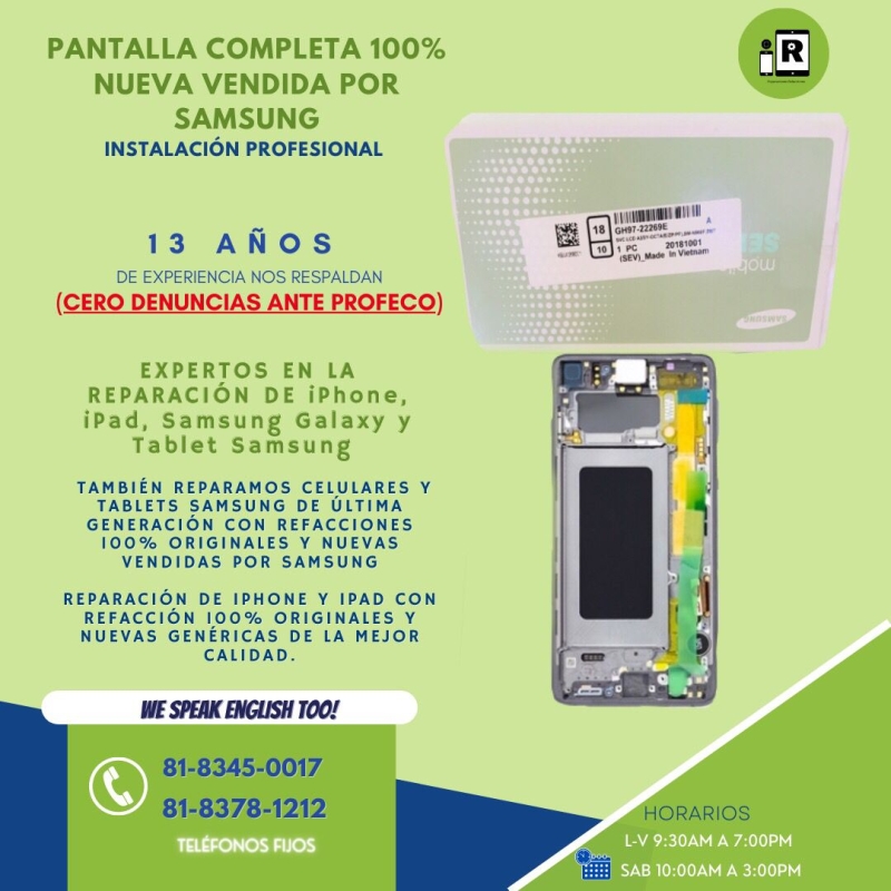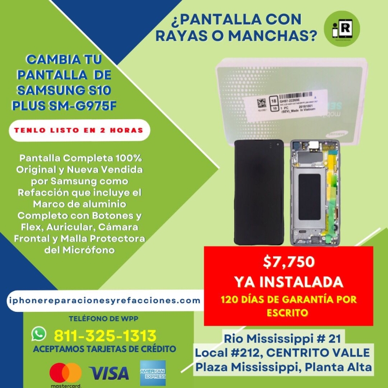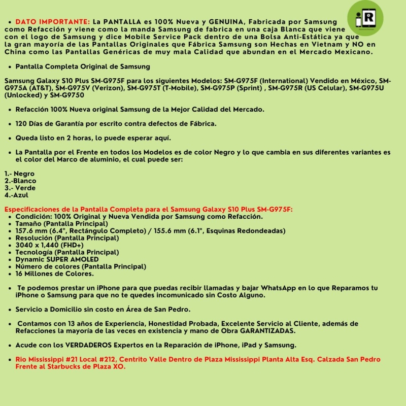 La gran ventaja de haber adquirido un Smart Phone S10 Plus es que Samsung Si vende Refacciones Genuinas y Nuevas y tu podrás preguntarte como saber que una Pantalla es 100% Original y Nueva y que fue vendida como Refaccion por Samsung y tu lo puedes distinguir porque principalmente las Pantalla de S10 Plus Modelo SM-G975F que es el modelo que se vende en Mexico viene con el Marco de Aluminio Completo con Botones y Flexes incluidos así como del Auricular, el Vibrador y la Malla protectora del Altavoz que vienen sellados y no podrá entrar el agua y trae protectores plásticos en todo el rededor de el Marco de Aluminio donde vienen los Botones con los Flexes además de que traen otros protectores plásticos por dentro de la Pantalla que se localizan de izquierda a derecha y de arriba a abajo en el Micrófono Superior, en el Protector de los Lentes de las Cámaras, en el Auricular, en el Flex de Proximidad, en el Procesador de la Tarjeta Madre que esta a un lado del conector principal de la Pantalla y en el Micrófono Inferior que nunca podrá traer una Pantalla Usada y así exactamente como vez en las fotografías de la publicación recibirás la nueva Pantalla en su caja Original con el Logo de Samsung y dice en la caja Mobile Service Part con Bolsa Antiestática además incluimos el Adhesivo Original y Nuevo para la Carcasa Trasera y si tienes alguna otra pregunta o duda estamos para aclarar antes de que hagas tu compra para que este completamente bien convencido de lo que estas comprando por eso damos 120 días de garantía sobre defectos de fabrica y hasta la fecha no nos ha fallada ni una sola pantalla que hemos vendido en línea o instalado en nuestro Laboratorio Especializado, esa es la gran ventaja de vender refacciones 100% Genuinas y Nuevas.