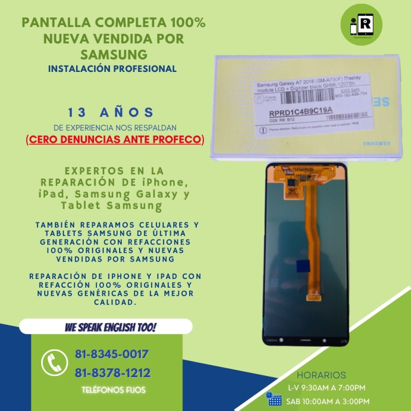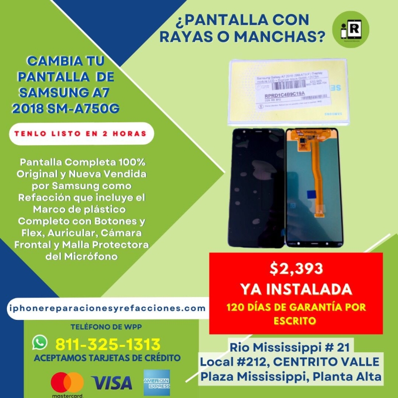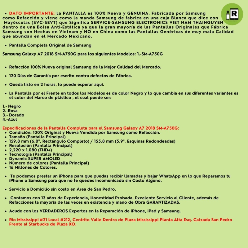 La gran ventaja de haber adquirido un Smartphone A7 2018 es que Samsung Si vende Refacciones Genuinas y Nuevas y tu podrás preguntarte como saber que una Pantalla que me están ofreciendo es 100% Original y Nueva y que fue fabricada por Samsung y no fue reconstruida por compañias ajenas a Samsung? Tu lo puedes distinguir principalmente porque las Pantalla de A7 2018 modelo SM-A750G que es el modelo que se vende en Mexico No trae ningun sello o marca que acostumbran poner las diferentes compañias por las que pasa la pantalla antes de llegar al cliente final y trae un plasticos protectores azules que vienen colocados en la parte trasera de la pantalla y recibirás la nueva Pantalla en su caja Original con el Logo de Samsung y dice en la caja Mobile Service Pack con Bolsa Antiestática y viene exactamente como la vez en las fotografías de la publicacion y si tienes alguna otra pregunta o duda estamos para aclararla antes de que hagas tu compra para que este completamente bien convencido de lo que estas comprando por eso damos 120 días de garantía sobre defectos de fabrica y hasta la fecha no nos ha fallada ni una sola pantalla que hemos vendido en línea o instalado en nuestro Laboratorio Especializado esa es la gran ventaja de vender refacciones 100% Genuinas y Nuevas.