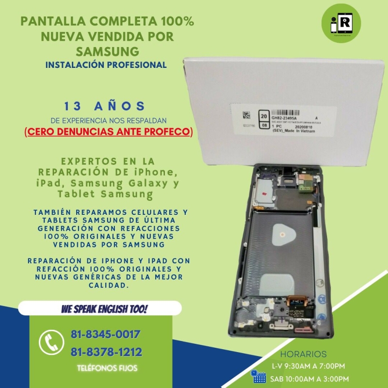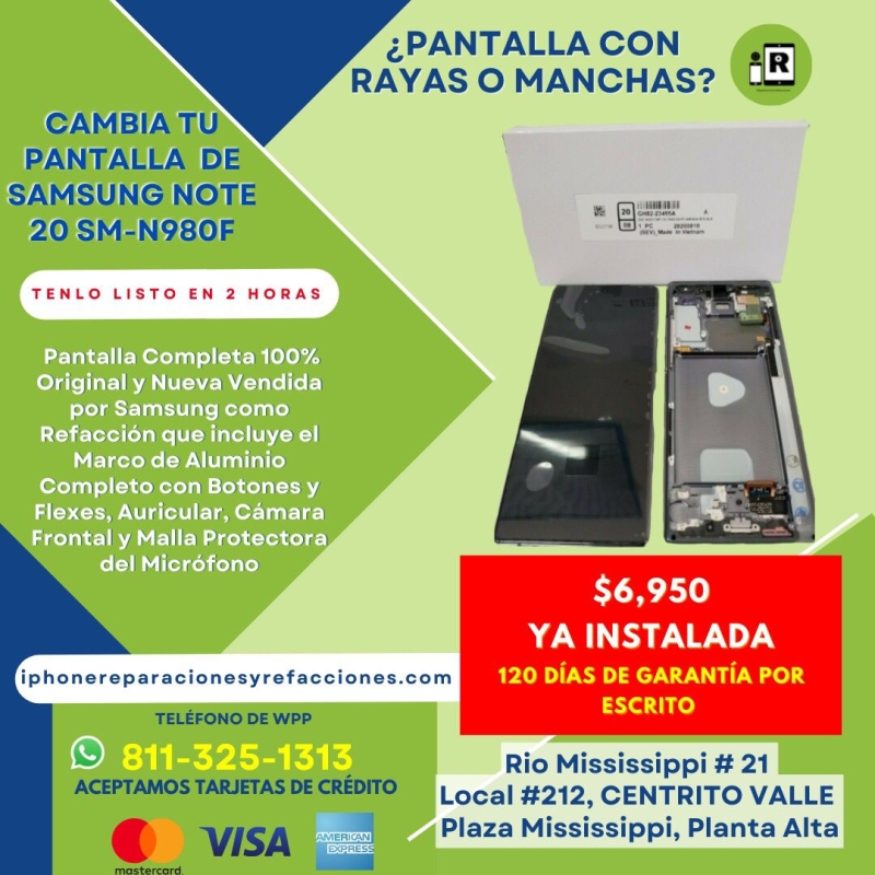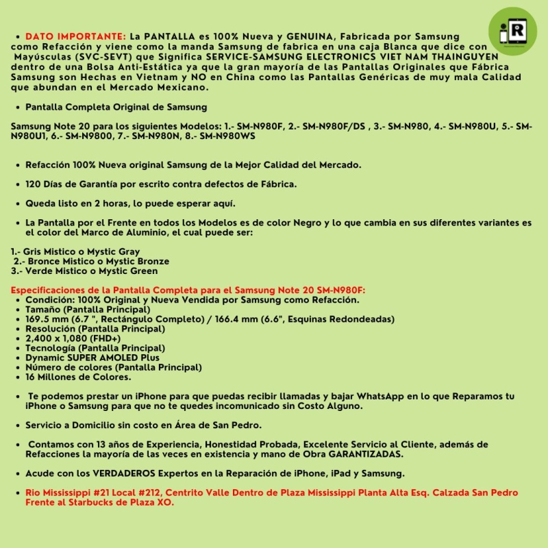 La gran ventaja de haber adquirido un Smartphone NOTE 20 es que Samsung Si vende Refacciones Genuinas y Nuevas y tu podrás preguntarte como saber que una Pantalla es 100% Original y Nueva y que fue vendida como Refacción por Samsung y tu lo puedes distinguir porque principalmente las Pantalla de NOTE 20 Modelo SM-N980F que es el modelo que se vende en México viene con el Marco de Aluminio Completo con Botones y Flexes incluidos así como del Auricular, el Vibrador y la Malla protectora del Altavoz que vienen sellados y no podrá entrar el agua y trae protectores plásticos en todo el rededor de el Marco de Aluminio donde vienen los Botones con los Flexes además de que traen otros protectores plásticos por dentro de la Pantalla que se localizan de izquierda a derecha y de arriba a abajo en el Micrófono Superior, en el Protector de los Lentes de las Cámaras, en el Auricular, en el Flex de Proximidad, en el Procesador de la Tarjeta Madre que esta a un lado del conector principal de la Pantalla y en el Micrófono Inferior que nunca podrá traer una Pantalla Usada y así exactamente como vez en las fotografías de la publicación recibirás la nueva Pantalla en una 1 Caja Blanca con 1 Etiqueta Adherida con la que manda Samsung con toda la información Completa de la pantalla que estás comprando con las Letras Mayúsculas en Negro SEVT-SVC por los 2 lados y a su vez la Pantalla viene dentro de una Bolsa Antiestática con 1 Etiqueta Adherida con la que manda Samsung con toda la información Completa y si tienes alguna otra pregunta o duda estamos para aclarar antes de que hagas tu compra para que este completamente bien convencido de lo que estas comprando por eso damos 120 días de garantía sobre defectos de fabrica y hasta la fecha no nos ha fallada ni una sola pantalla que hemos vendido en línea o instalado en nuestro Laboratorio Especializado, esa es la gran ventaja de vender refacciones 100% Genuinas y Nuevas.