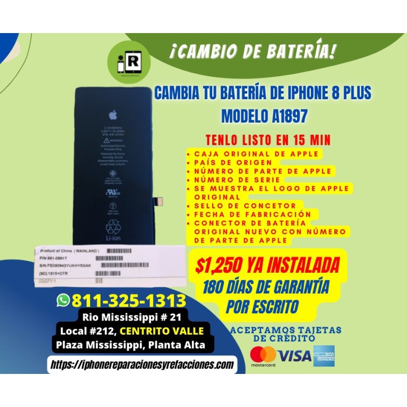 Cambio de BaterÃa para iPhone 8 Plus 100% Original y Nueva en Monterrey viene en Caja de Apple sellada con Número de Serie y con 180 DÃas de GarantÃa