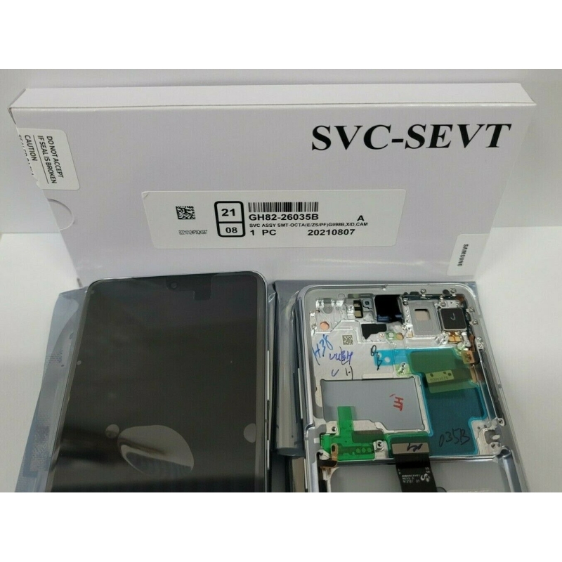 La gran ventaja de haber adquirido un Smartphone S21 Ultra es que Samsung Si vende Refacciones Genuinas y Nuevas y tu podrás preguntarte como saber que una Pantalla es 100% Original y Nueva y que fue vendida como Refacción por Samsung y tu lo puedes distinguir porque principalmente las Pantalla de S21 Ultra Modelo SM-G998B que es el modelo que se vende en México viene con el Marco de Aluminio Completo con Botones y Flexes incluidos así como del Auricular, el Vibrador y la Malla protectora del Altavoz que vienen sellados y no podrá entrar el agua y trae protectores plásticos en todo el rededor de el Marco de Aluminio donde vienen los Botones con los Flexes además de que traen otros protectores plásticos por dentro de la Pantalla que se localizan de izquierda a derecha y de arriba a abajo en el Micrófono Superior, en el Protector de los Lentes de las Cámaras, en el Auricular, en el Flex de Proximidad, en el Procesador de la Tarjeta Madre que esta a un lado del conector principal de la Pantalla y en el Micrófono Inferior que nunca podrá traer una Pantalla Usada y así exactamente como vez en las fotografías de la publicación recibirás la nueva Pantalla en una 1 Caja Blanca con 1 Etiqueta Adherida con la que manda Samsung con toda la información Completa de la pantalla que estás comprando con las Letras Mayúsculas en Negro SEVT-SVC por los 2 lados y a su vez la Pantalla viene dentro de una