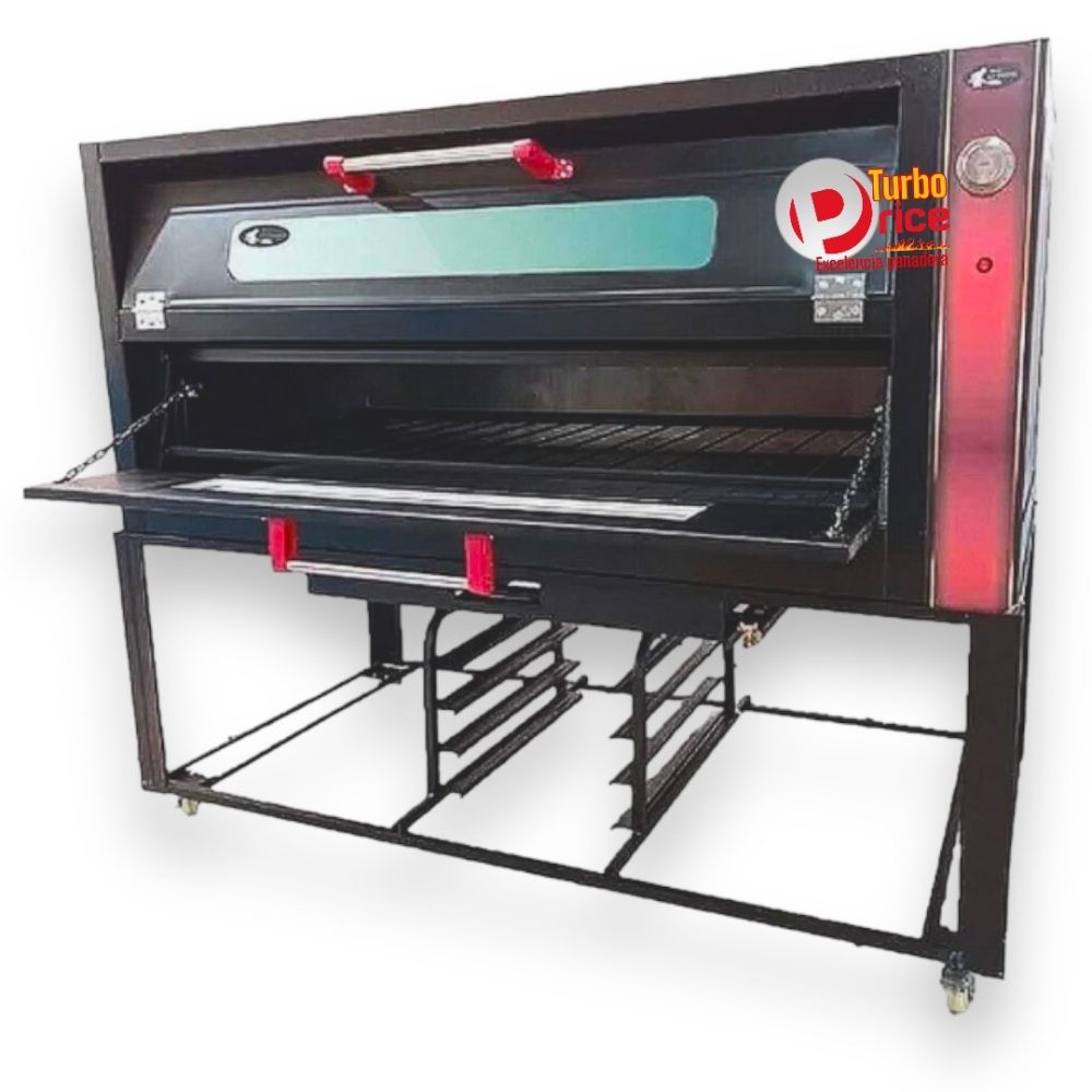 En la parte inferior incluye un espiguero para recibir charolas de 45 x 65cms e incluye llantas de doble rodamiento y sistema de frenos lleva tu horno a donde quieras o bien muévelo de lugar con facilidad