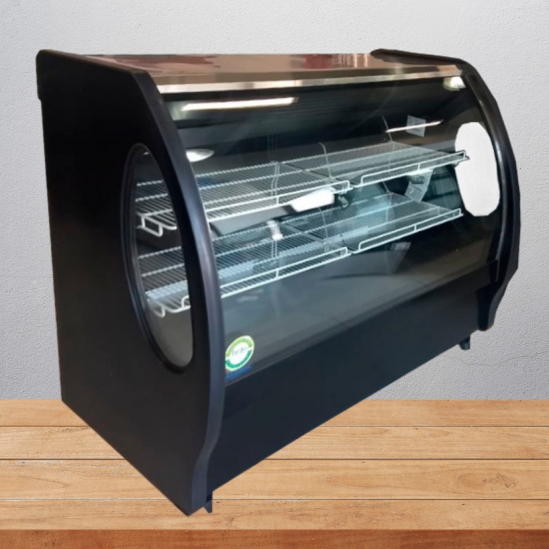Vitrina marca MASSER modelo 1500-EP, vidrio curvo, metro y medio, parrillas ajustables, negra