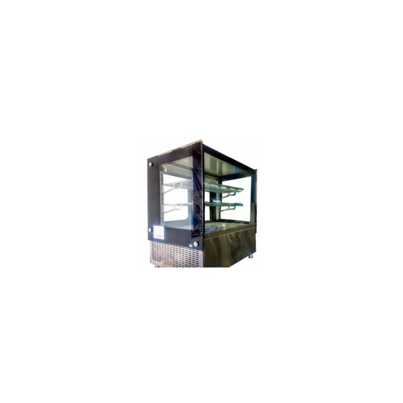 Vitrina Full glass de Mostrador para PRODUCTO REFRIFERADO O CALIENTE, ideal para venta de impulso, entrepaños de Parrillas ajustables a diferentes alturas, temperatura de refrigeración de 2ºC en adelante y CALIENTE HASTA 50ºC, puertas traseras deslizables, patas niveladoras. DISPONIBLE TAMBIEN EN ACERO INOXIDABLE