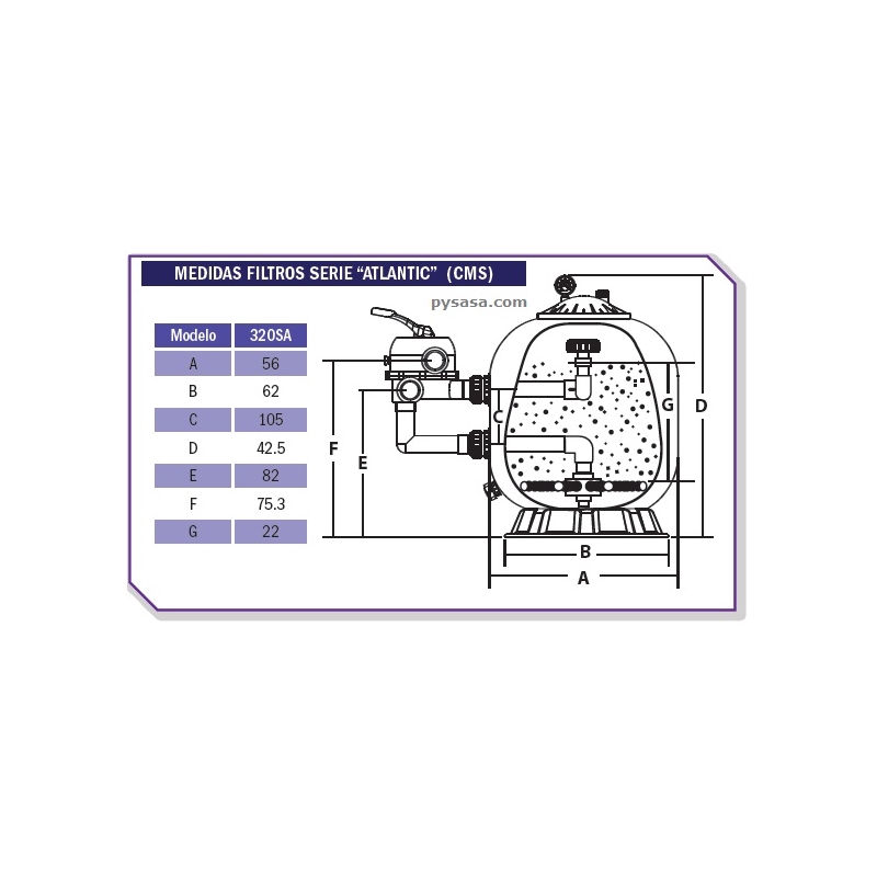 Dimensiones: A: 82 cm - B: 75.3 cm - C: 22 cm - D: 105 cm - E: 56 cm - F: 62 cm - G: 42.5 cm