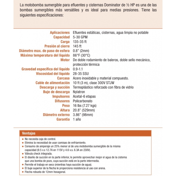 Comentarios y calificaciones: Bomba Sumergible Dominator de 0.5HP, 20GPM, 6 Etapas, 115 volts