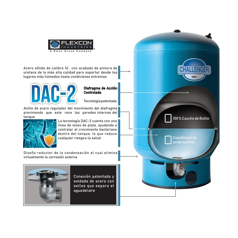 Los tanques precargados serie Challenger de FEXCON están construidos en acero al carbón calibre 16', lo que les proporciona robustez y durabilidad. El cuerpo del tanque está montado sobre una base resistente y ligera, que le proporciona estabilidad mecánica. Tiene excelente resistencia a la corrosión debido a su acabado en pintura de Uretano, la que le da un acabado perfecto para soportar los ambientes más húmedos y condiciones extremas. El diafragma de acción controlada cuenta con la tecnología patentada DAC-2 así como un anillo de acero regulador del movimiento que previene el roce con las paredes internas del tanque, es resistente y no tiene costuras, lo que previene su ruptura. La tecnología DAC-2 cuenta con una línea de iones de plata, que evita el crecimiento bacteriano dentro del tanque.