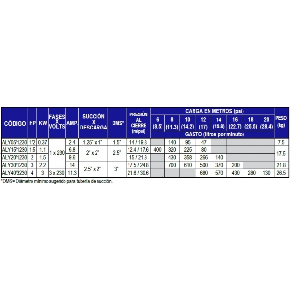 • • Paso de sólidos permitido: 19 mm (ALY05: 8 mm)