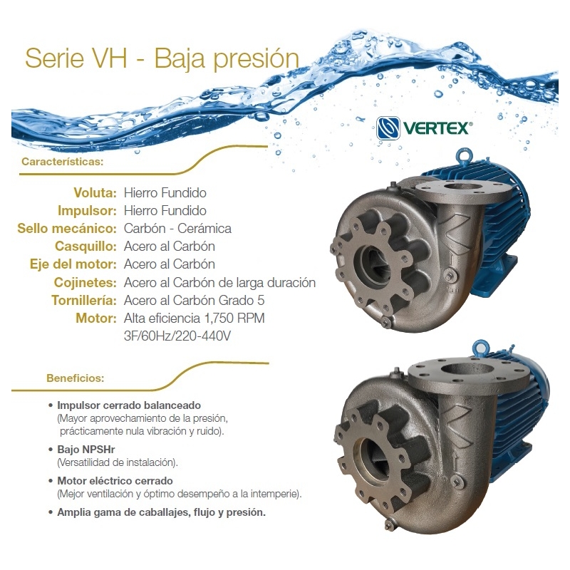 La nueva serie VH de VERTEX es ideal para todas aquellas aplicaciones donde la presión requerida va de moderada a alta. Está conformada por una amplia gama de modelos y caballajes con motores de alta velocidad (1,750 RPM) trifásicos manteniendo los beneficios y ventajas de su menor la serie VL: construcción compacta y robusta de larga vida. Sus principales características y materiales son: